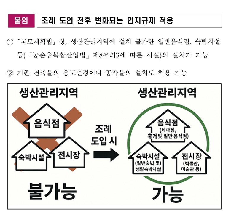 그동안 생산관리지역 내에서는 농촌융복합산업 경영체 사업에 필요한 가공·직판·외식·체험·숙박시설 등을 설치할 수 없었다.