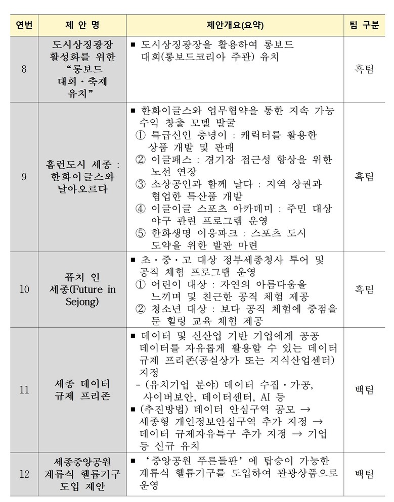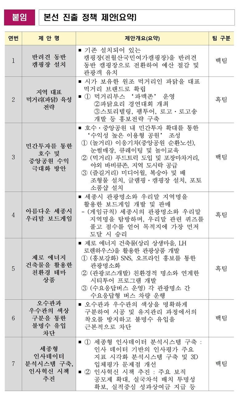 이에 맞선 흑팀 참가자들은 ▲지역 대표 먹거리(파닭) 육성 전략 ▲아름다운 세종시 우리말 보드게임 ▲제로 에너지 건축물을 활용한 친환경 테마 상품 등 6개 정책으로 대결에 나선다.