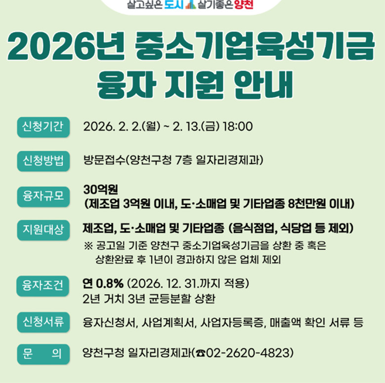 - 공고일 기준 사업자등록 6개월 경과된 관내 중소기업·소상공인 대상, 2/13까지 신청 [양천구 세계타임즈=이장성 기자] 양천구(구청장 이기재)는 경기침체 장기화로 경영 부담이 가중되고 있는 중소기업과 소상공인의 자금난 완화를 위해 2026년 상반기 30억 원 규모의 ‘중소기업 육성기금’ 융자 지원에 나선다고 3일 밝혔다.