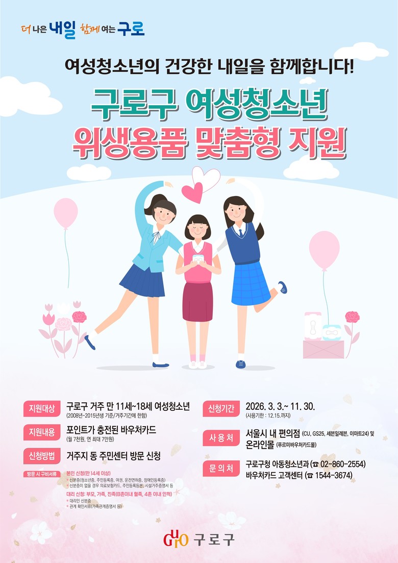 - 3월 3일부터 동주민센터 신청 [구로구 세계타임즈=이장성 기자] 구로구(구청장 장인홍)가 3월부터 관내 여성청소년을 대상으로 생리용품(위생용품) 바우처 지원 사업을 시행한다. 구는 기존 학교·청소년시설 비치 방식에서 바우처카드 방식으로 전환해 청소년의 이용 편의와 제품 선택권을 강화했다.