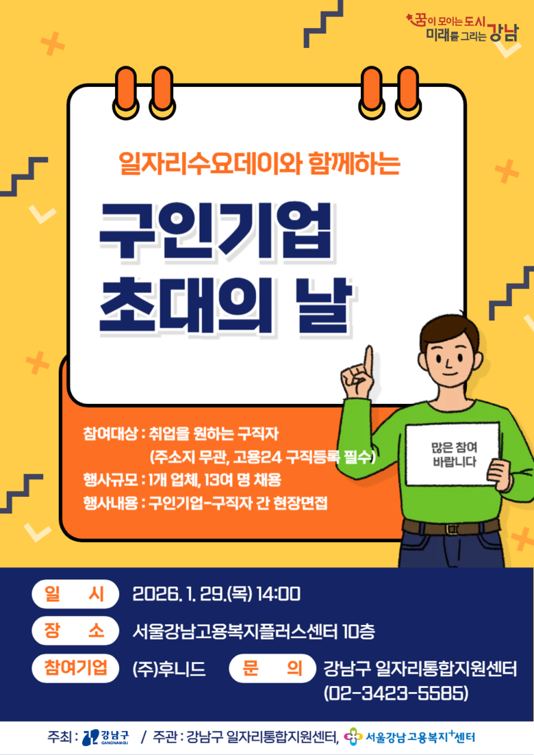 이번 행사에는 ㈜후니드가 참여해 호텔 청소와 주방 보조 인력 등 총 13명을 채용할 예정이다. 참여를 희망하는 구직자는 1월 28일까지 강남구 일자리통합지원센터(☎02-3423-5585)를 통해 사전 신청하면 되며, 행사 당일 현장 등록을 통해서도 면접에 참여할 수 있다.