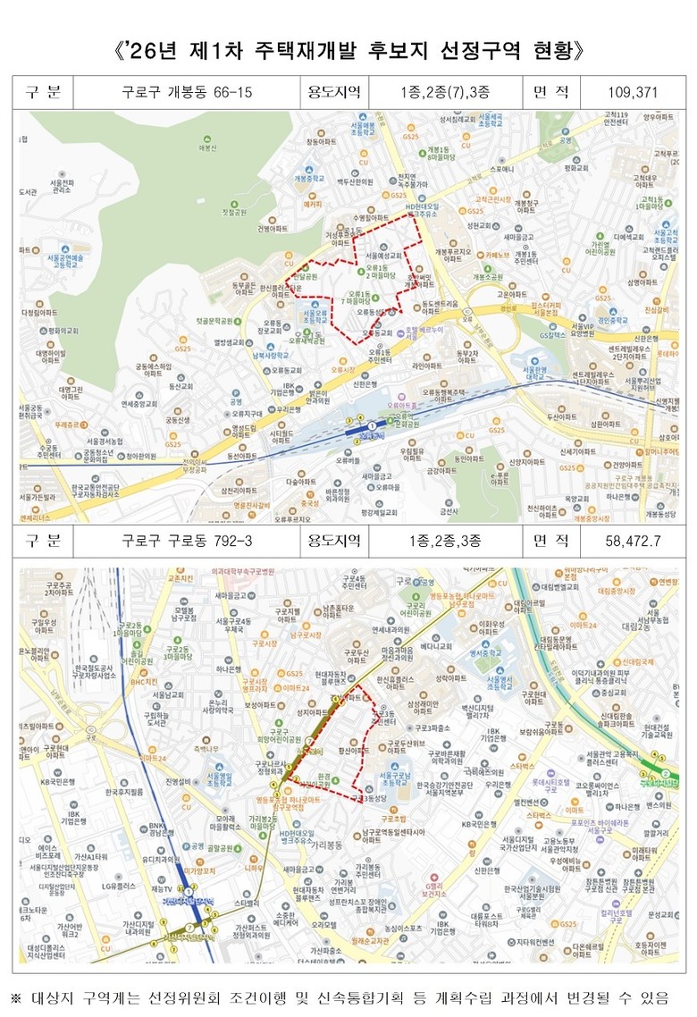 서울시는 지난 23일(월) ‘2026년 제1차 주택재개발 후보지 선정위원회’를 열고 구로구 개봉동 66-15, 불광동 442/445 일대 등을 신통기획 후보지로 선정했다고 밝혔다.