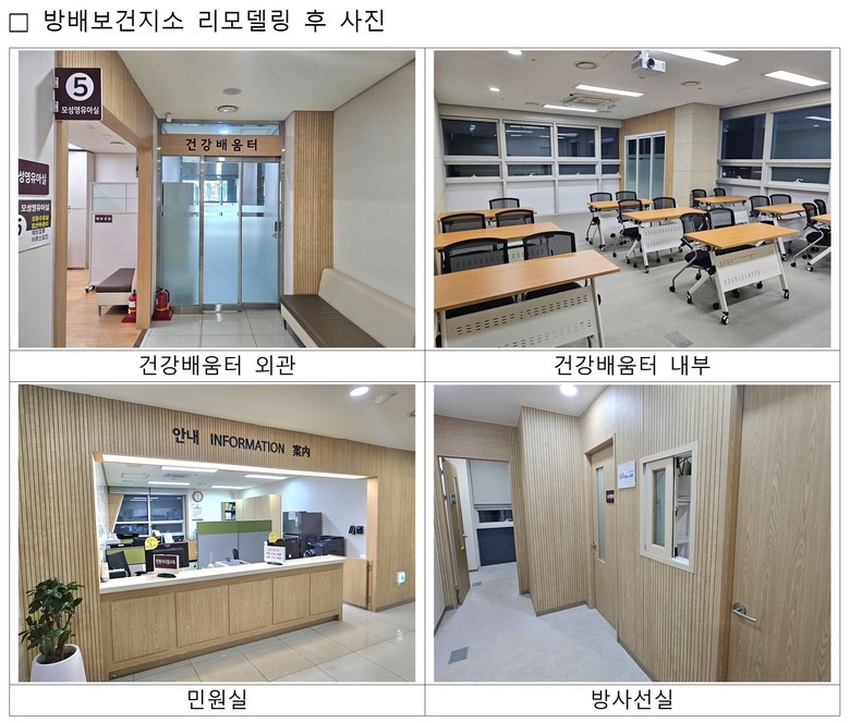 - 전성수 구청장, “앞으로도 주민 건강 증진을 위한 보건 인프라 지속 확충할 것” [서초구 세계타임즈=이장성 기자] 서울 서초구(구청장 전성수)는 방배보건지소 이용 주민의 안전성과 편의성 향상을 위해 기존 방사선실과 민원실 환경을 개선하고 주민 교육실을 새롭게 조성하는 등 리모델링을 완료했다고 밝혔다.