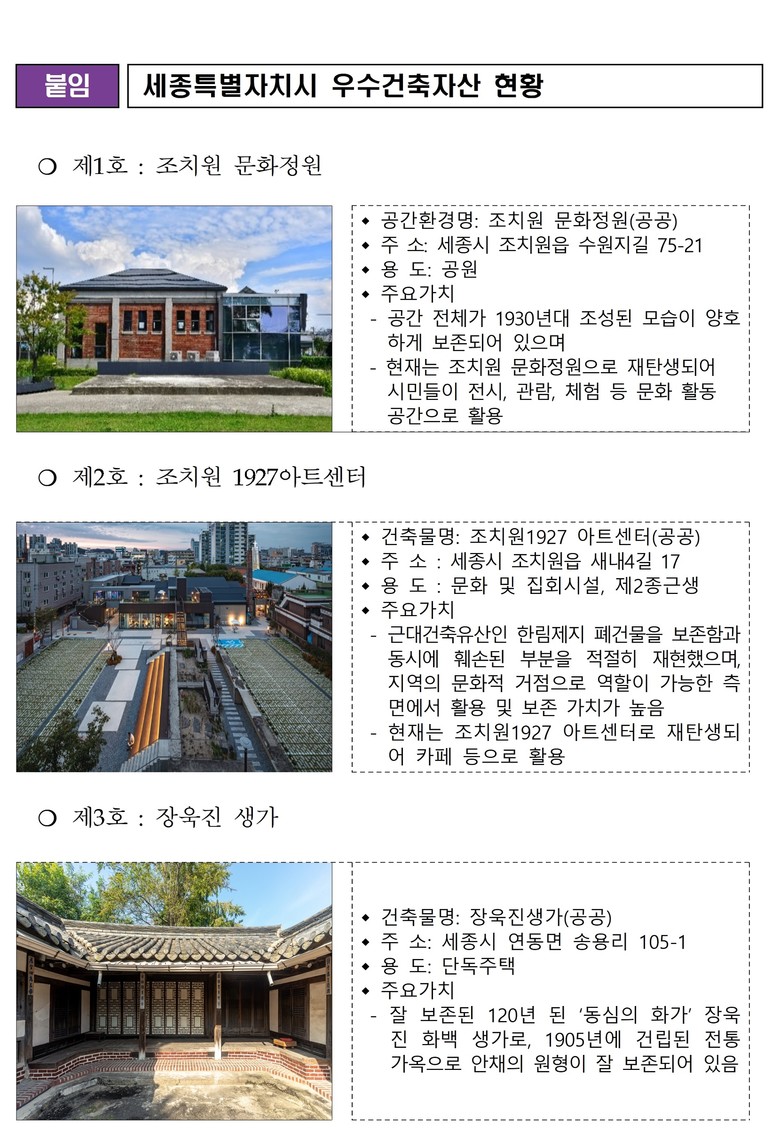 이번에 시에서 우수건축자산으로 등록되는 3곳은 ‘세종특별자치시 제2차 건축자산 진흥 시행계획 수립’ 용역을 통해 발굴한 것이다.