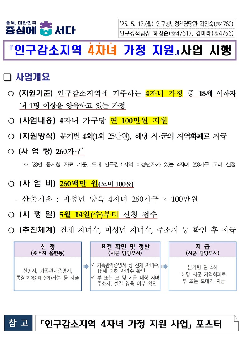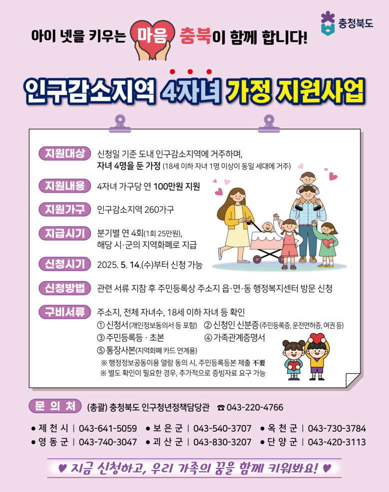 지원 대상은 도내 인구감소지역(제천·보은·옥천·영동·괴산·단양)에 거주하며 자녀 4명 중 18세 이하 자녀 1명 이상이 주민등록상 동일 세대에 포함된 가구이다.