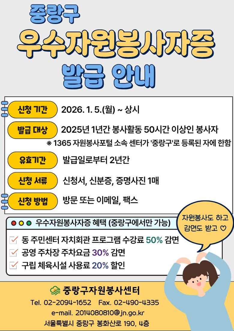 발급 대상은 지난 2025년 1년간 총 50시간 이상 봉사활동을 실천하고, 1365 자원봉사포털 소속 센터가 ‘중랑구’로 등록된 봉사자다. 우수자원봉사자증 소지자에게는 발급일로부터 2년간 ▲주민센터 자치회관 프로그램 수강료 50% 감면 ▲공영주차장 주차 요금 30% 감면 ▲구립 체육시설 사용료 20% 할인 등의 인센티브가 제공된다.
