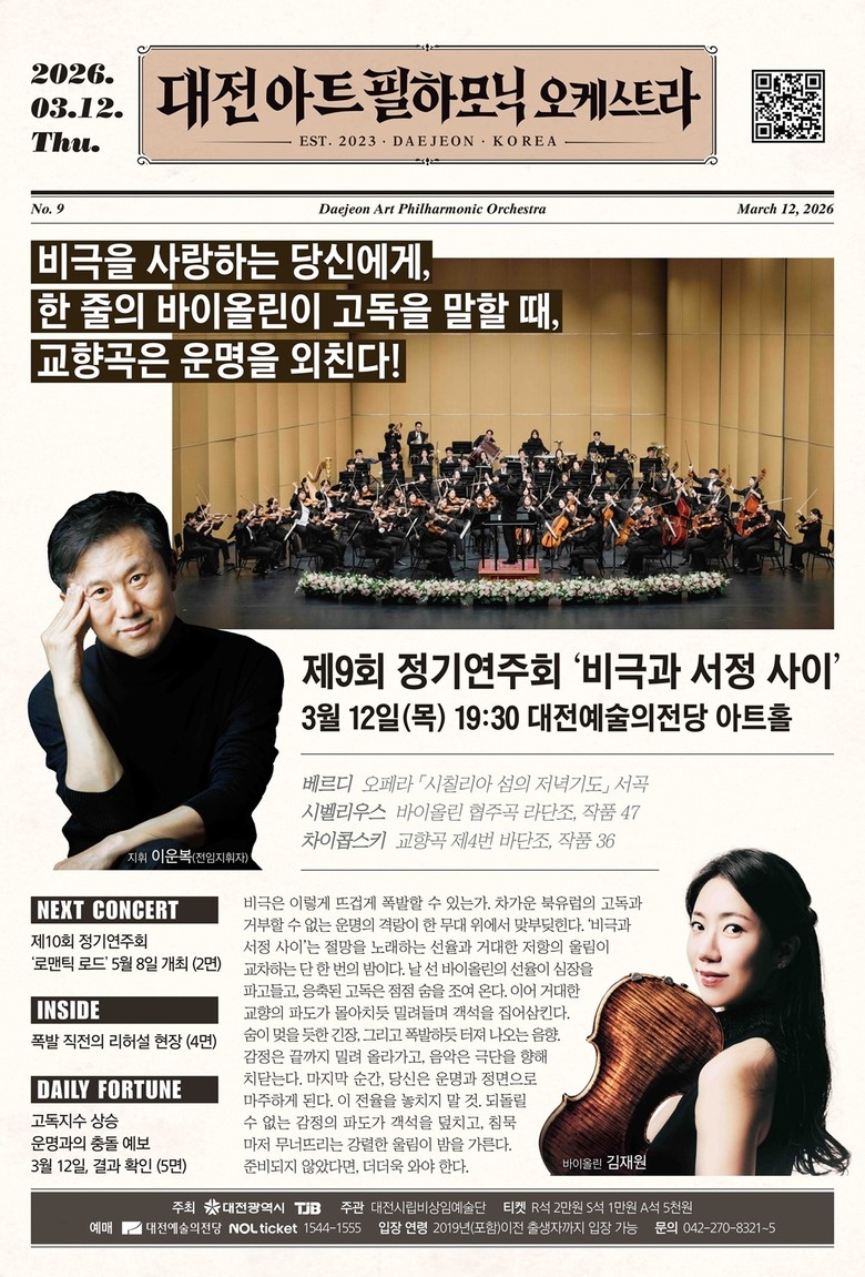 대전아트필 관계자는 “우리 삶의 피할 수 없는 ‘운명’과 그 속에서 피어나는 ‘서정적 위로’를 음악으로 들려드리는 무대”라며, “관객분들이 일상의 고단함을 잠시 내려놓고, 비극을 넘어선 환희의 에너지를 경험하는 시간이 되길 바란다”라고 밝혔다.