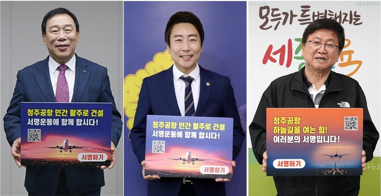 | ▲ (왼쪽부터) 최민호 세종시장, 임채성 세종시의회 의장, 최교진 세종시교육감이 14일 ‘청주공항 민간전용활주로 건설, 100만 서명운동 동참’ 피켓을 들고 활주로 확충의 당위성을 알리고 있다. |