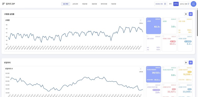 경기도일자리상황판은 고용, 산업, 경제, 인구 등 다양한 데이터를 통합해 지역별 일자리와 경제 흐름 변화를 종합적으로 파악할 수 있도록 구축된 데이터 기반 정책 지원 플랫폼이다.