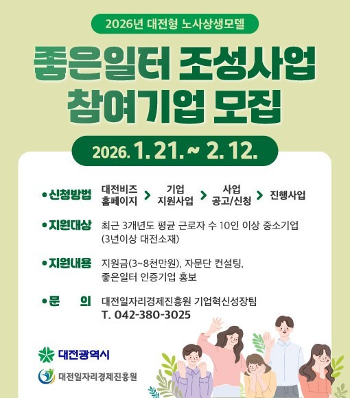 - 선정기업에 최대 8,000만 원 지원금과 자문 컨설팅 예정 - [대전 세계타임즈=이채봉 기자] 대전시는 1월 21일부터 2월 12일까지 대전형 노사상생 모델‘2026년 좋은 일터 조성사업’에 참여할 12개 기업을 공개 모집한다.