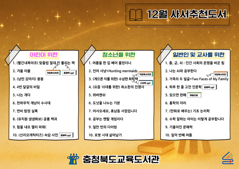 [충북 세계타임즈=이현진 기자] 충청북도교육청 직속기관 교육도서관(관장 이상래)은 <2025년 우리가 사랑한 책들(마무리)>을 주제로 2025년 언제나 책봄 열두달 북큐레이션 12월 사서추천도서 30권을 선정했다.