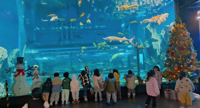 충북아쿠아리움의 주요 전시 공간인 메인 수조 앞에는 크리스마스트리와 눈사람 장식이 설치되어 겨울철의 따뜻하고 환상적인 분위기를 한층 더하고 있다. 여기에 메인 수조 속을 유영하는 철갑상어, 무태장어, 비단잉어 등 다양한 민물고기의 모습이 어우러지며, ‘물속에서 즐기는 크리스마스’ 포토존이 완성된다.