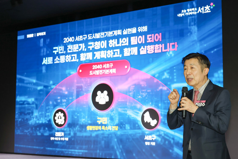 이날 발표에서는 ▲양재 일대를 중심으로 한 글로벌 AI 산업 거점 조성 ▲광역교통과 연구·행정 기능이 결합된 서초구청사 복합개발 ▲여의천–마방공원 일대의 복합여가 공간 조성 ▲위례과천선·경부고속도로 지하화 등 대규모 교통인프라 확충 등 서초구의 분야별 주요사업과 전략들을 소개했다.