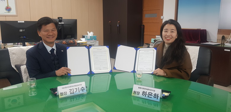 | ▲ 지역어린이집과 교육네트워크 구축사진(왼쪽부터 김기수 대전중리초등학교병설유치원원장, 주혜영 대전광역시동부여성가족원어린이집원장) |