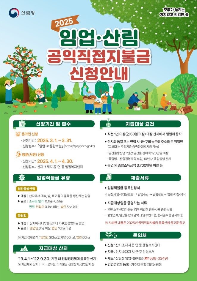 자세한 내용은 시 누리집에 등록된 공고문과 산림공원과 및 읍면 행정복지센터에서 확인하거나 산림청 임업직불금상담센터(☎1588-3249)에서 안내받을 수 있다.