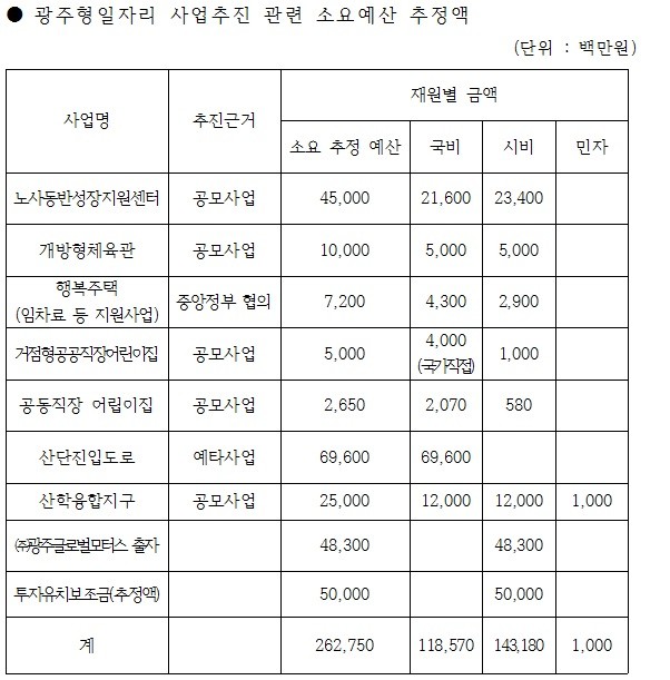 제출된 자료에 의하면 광주형 일자리 완성차공장 합작법인 설립과 관련하여 법인 출자금 483억, 투자유치보조금 추정액 500억여원, 노사동반 성장 지원센터 450억원, 개방형 체육관 100억원, 행복주택 임차료 등 지원사업 72억원, 거점형 공공 직장 어린이집 50억원, 공동 직장어린이집 26억 5천만원, 산단 진입도로 696억원, 산학 융합지구 250억원 등 2,627억 5천만원이 소요될 예정이다.