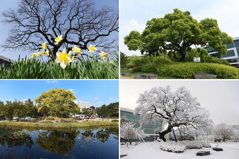 | ▲ 보호수 자료사진(천안종합운동장 실내체육관 앞 팽나무 사계절) |