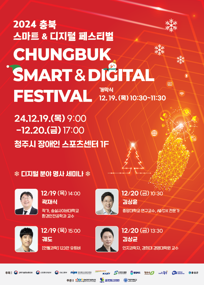 20일(금)에는 △충북 융합클러스터 성과보고 △‘클라우드 산업과 충북의 미래전략’을 주제로 한 과학기술포럼 △김상윤 연구교수(AI 특이점, 시대의 제조업 AX트랜드)와 김상균 인지과학자(AI 시대, 5가지 비즈니스 전략)의 AI를 주제로 한 강연이 마련되었다.