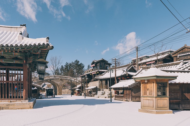 논산 선샤인랜드는 드라마 ‘미스터 션샤인’ 촬영지로 유명하며, 겨울철 눈 내린 고즈넉한 거리와 글로리호텔 2층 카페에서 즐기는 따뜻한 커피가 한층 더 깊은 정취를 선사한다.