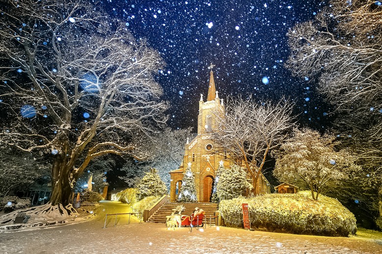 아산 공세리성당은 매년 크리스마스 시즌이면 성당 전체가 따뜻한 조명으로 밝혀져 특별한 겨울 정취를 전한다.