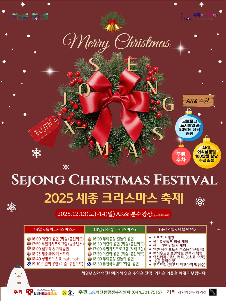 행사 기간 야외에서는 크리스마스 마켓이 열리고 AK& 세종 실내에서는 다양한 크리스마스 체험부스와 어린이들을 위한 특별공연이 펼쳐질 예정이다.