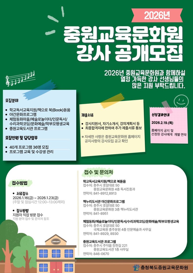 지원 자격은 해당 분야 전공자 또는 관련 자격증 소지자, 강의 경력자 등으로 프로그램 운영과 수강생 관리가 가능한 사람이면 지원할 수 있으며, 자세한 사항은 중원교육문화원 누리집 공지사항의 강사 모집 공고에서 확인할 수 있다.
