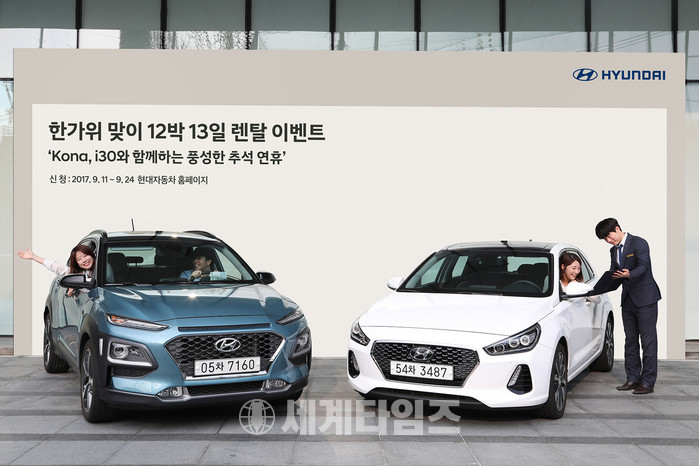 17일 업계 등에 따르면 현대자동차는 추석 명절 연휴에 소형 SUV 코나와 i30 등 차량을 귀성객들에게 무료로 대여해주는 '추석 귀향 지원 12박 13일 렌탈 이벤트'를 진행 중이다.