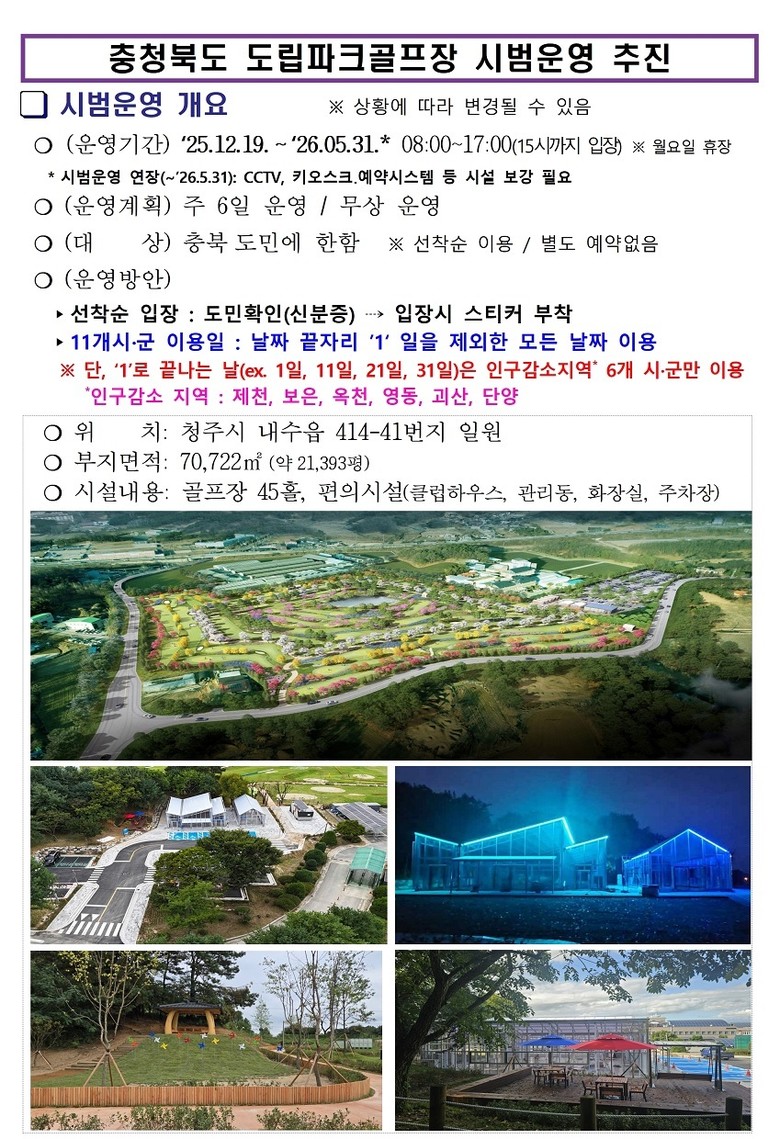 한편, 도립파크골프장은 충북 도민에 한해 신분증 확인 후 선착순 입장이 가능하며, 매월 날짜 끝자리가 1인 날(1, 11, 21, 31일)은 인구감소지역(제천, 보은, 옥천, 영동, 괴산, 단양) 도민들만 전용으로 이용할 수 있는 특별 운영제를 시행 중이다.