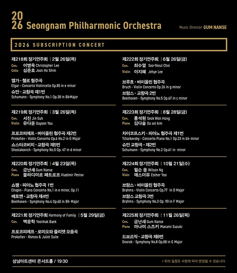 예술총감독 금난새와 수준높은 연주로 사랑받는 성남시향은 2026년을 새롭고 다채로운 프로그램으로 화려하게 만들어 갈 것이다.