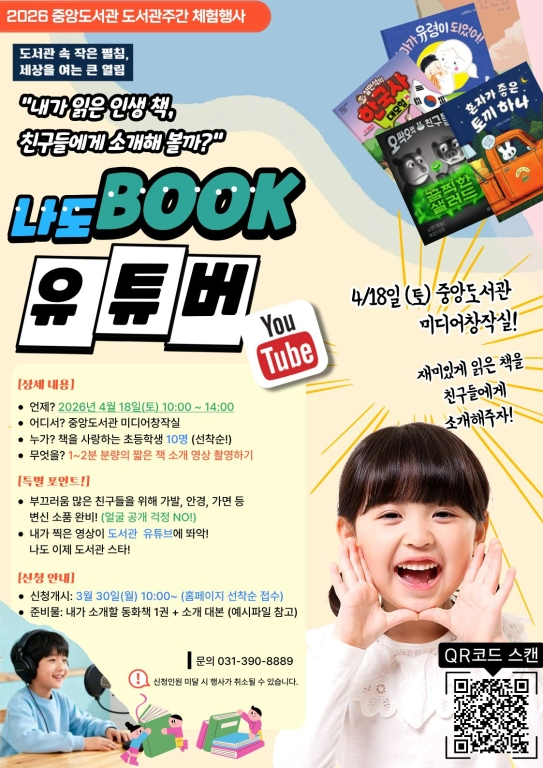 이와 함께 미디어창작실 체험행사 「나도 Book 유튜버」를 통해 어린이들이 직접 책을 소개하는 유튜브 콘텐츠를 기획하고 제작해 보는 특별한 경험을 선사하고 중앙도서관 야외광장에서는 나태주 시인의 시화전 「풀꽃, 바람에 읽히다」를 통해 가족, 친구, 연인과 함께 산책하듯 즐기며 마음을 채우는 시간을 제공한다.