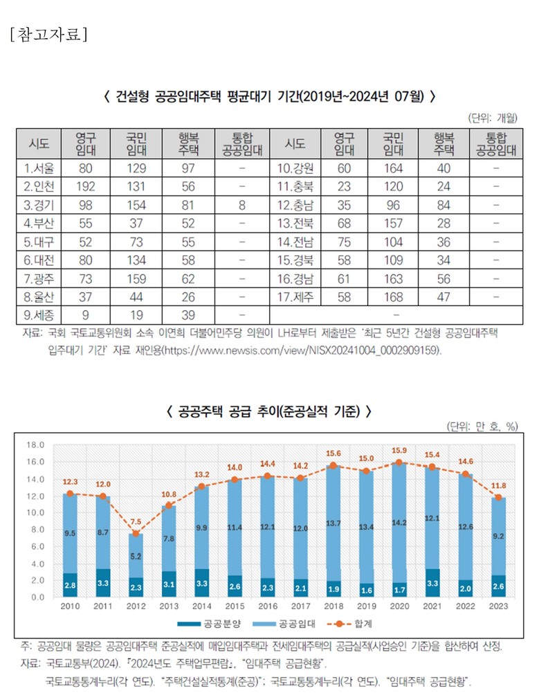 또한 청년, 신혼부부, 고령층, 전세사기 피해 가구 등 대상별 맞춤형 임대주택을 정밀하게 공급하고, 반복적으로 비는 주택은 긴급 수요에 신속 배정하는 체계를 상시화해 대기 기간을 줄여야 한다고 제안했다. 지역별로는 공공임대 재고 비율 목표를 설정하고, 이를 달성하는 지자체에 재정 인센티브를 연계해 수도권과 비수도권 간 격차를 완화하는 방안도 포함됐다.