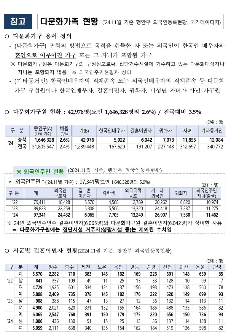이 같은 증가세는 결혼이민자 가정의 안정적인 정착과 지역사회 기반 확립을 보여주는 지표로 해석된다. 특히 청주·진천·음성 등 산업단지와 교육 인프라가 밀집한 지역을 중심으로 가족 단위의 정착형 다문화가정이 꾸준히 늘고 있는 것으로 나타났다.