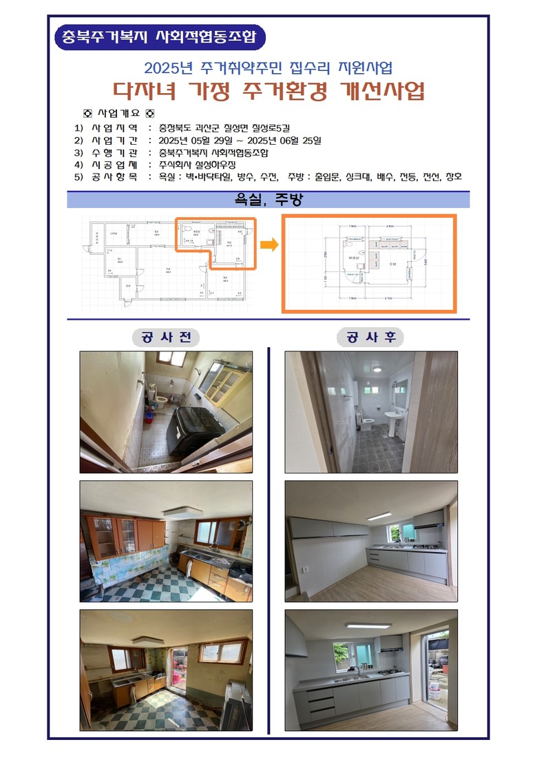 이번에 1호 가정으로 리모델링이 완료된 된 괴산군의 지모씨 가정은 4명의 자녀를 키우는 다문화 가정이다. 기존 주택은 준공한지 45년이 지나 지붕 누수로 벽면에 곰팡이가 생기고, 단열 부족으로 겨울엔 한기가 심하고 여름엔 무더위에 취약한 상태였다. 이번 리모델링을 통해 지붕 방수와 창호 교체, 내벽 단열, 주방 및 화장실 개선 등 주택 전반의 생활환경이 대폭 개선되었다.