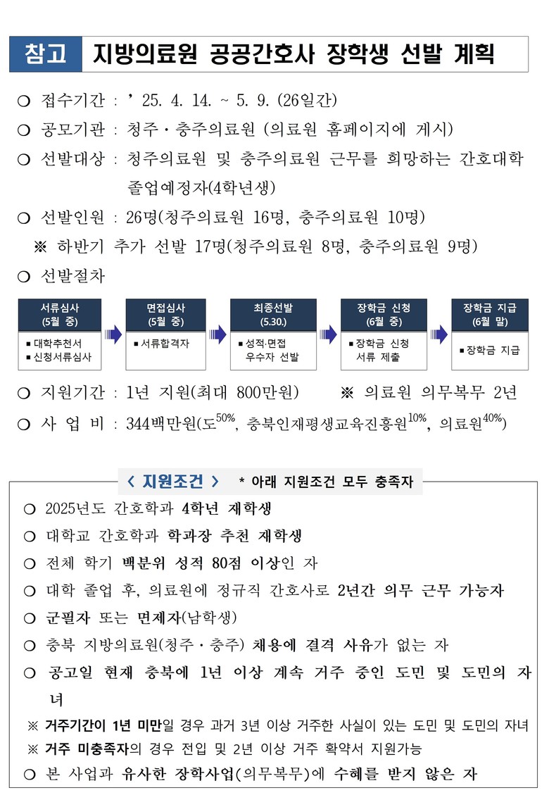 한찬오 충북도 보건정책과장은 “공공간호사 장학사업을 통해 지역 공공의료를 책임지는 의료원에 간호인력을 적극적으로 지원하고, 이를 통해 지역 주민들에게 더 나은 의료 서비스를 제공할 수 있을 것으로 기대된다.”고 말했다.