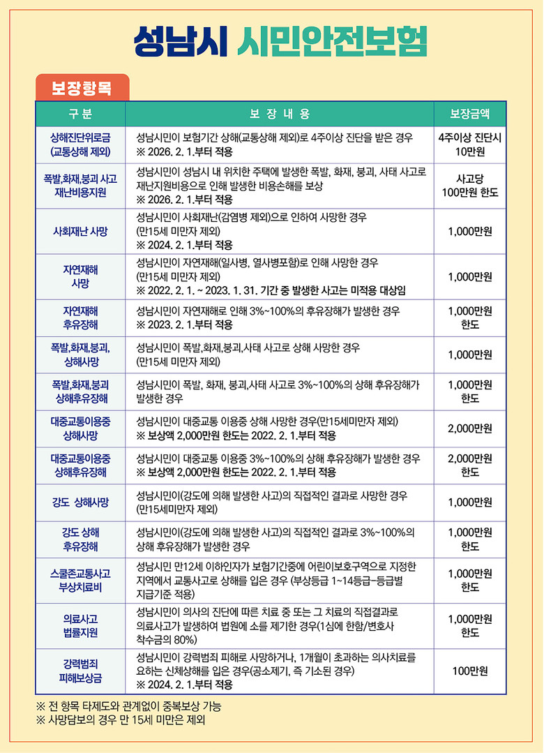 이번 보장 확대에 따라 시민안전보험 보장항목은 기존 12개에서 14개로 늘어났다. 성남시에 주민등록을 둔 시민이라면 외국인을 포함해 별도 가입 절차 없이 자동 가입되며, 개인보험과 중복 적용도 가능하다.