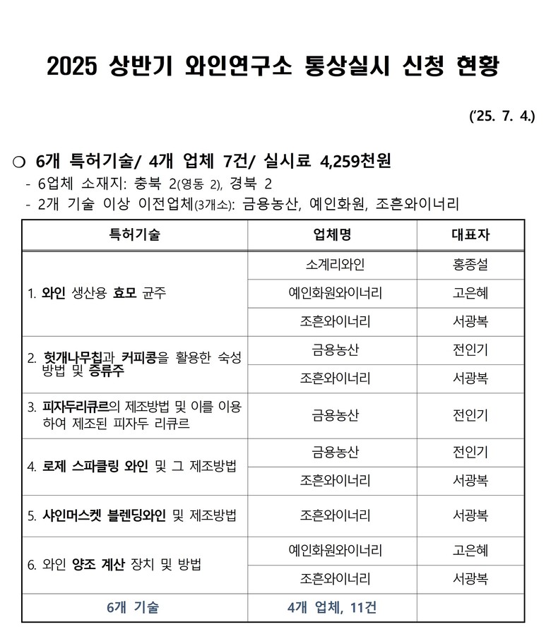 ‘샤인머스켓 블렌딩 와인 제조기술’은, pH가 높고 총산이 낮아 양조 적성이 떨어지는 샤인머스켓에 패션프루트 등을 소량 블렌딩해 맛, 향, 기능성, 가격 경쟁력을 모두 높일 수 있는 기술이다. 또한, 피자두·귤피·히비스커스 등을 증류주에 침출시켜 색감과 풍미를 살리는 ‘피자두 리큐르 제조기술’도 함께 이전됐다.