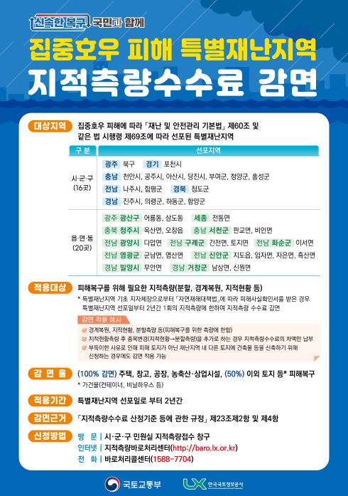 감면 대상은 호우 피해복구를 위해 측량 수행기관인 한국국토정보공사에 의뢰하는 지적 측량(분할, 경계복원, 지적현황 등)이며, 특별재난지역 선포일로부터 2년간 감면받을 수 있다.