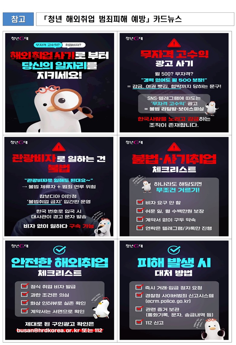 이어, “특히 '고수익 보장', '지인 추천' 형태로 접근하는 해외 일자리 제안의 대부분은 허위이거나 범죄와 연계된 경우가 많아, 청년 본인은 물론 부모와 가족 모두가 각별한 주의를 해 주시기 바란다”라고 당부했다.