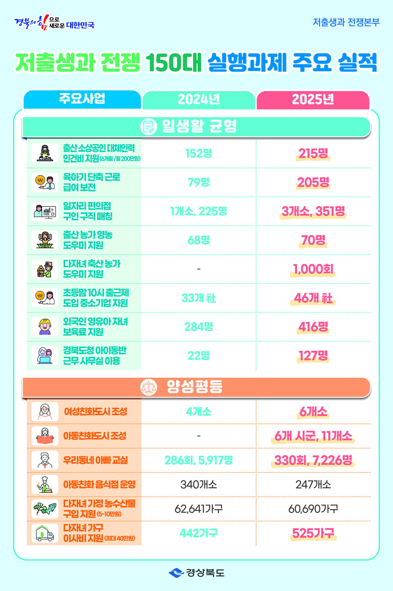 양성평등 분야에서는 아빠 교실 프로그램 7,226명(330회), 다자녀 가정 농수산물 구매 지원 6만 690가구, 다자녀 가구 이사비 지원 525가구, 아동 친화 음식점 247개소를 운영했고, 2025년에는 아동친화도시 11개소, 여성친화도시 7개소를 신규 지원했다.