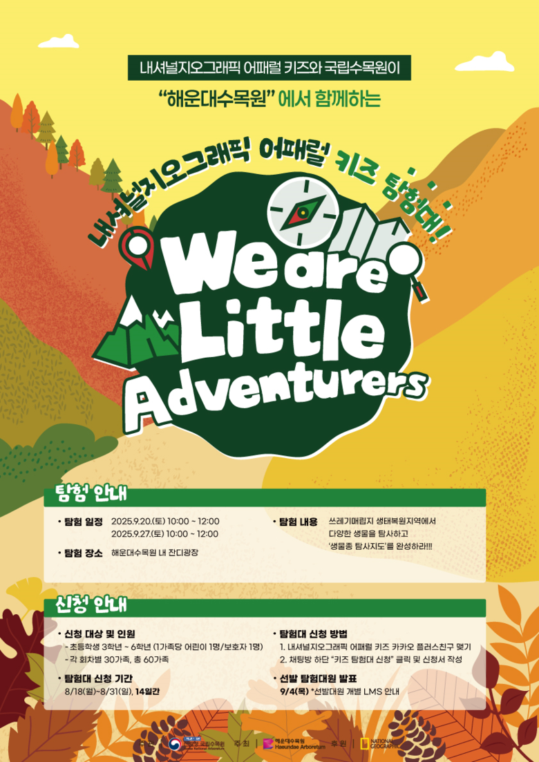[부산 세계타임즈=이용우 기자] 푸른도시가꾸기사업소는(이하 사업소) 국립수목원, ㈜더네이쳐홀딩스(내셔널지오그래픽 어패럴 키즈)와 함께 해운대수목원에서 「하반기 키즈탐험대」(이하 행사)를 개최한다고 밝혔다.