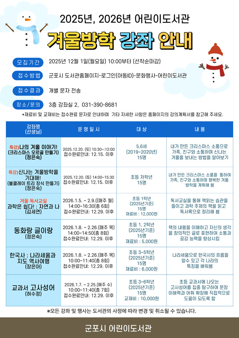모든 강좌는 12월 1일 오전 10시부터 군포시도서관 홈페이지 ‘문화행사’ 메뉴에서 접수할 수 있다. 어린이도서관 관계자는 “이번 겨울방학 프로그램은 어린이들이 도서관에서 책과 함께 즐거운 시간을 보내고, 다양한 강좌를 통해 창의력과 지식을 키울 수 있는 소중한 기회가 될 것”이라며 “많은 어린이가 적극적인 참여를 바란다”며 겨울방학의 시작을 알렸다.