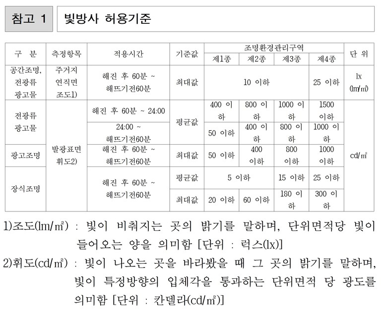 * 빛방사 허용기준 : 조명환경관리구역 제3종(주거지역) 800 cd/㎡ 이하, 제4종(상업지역) 1,000 cd/㎡ 이하