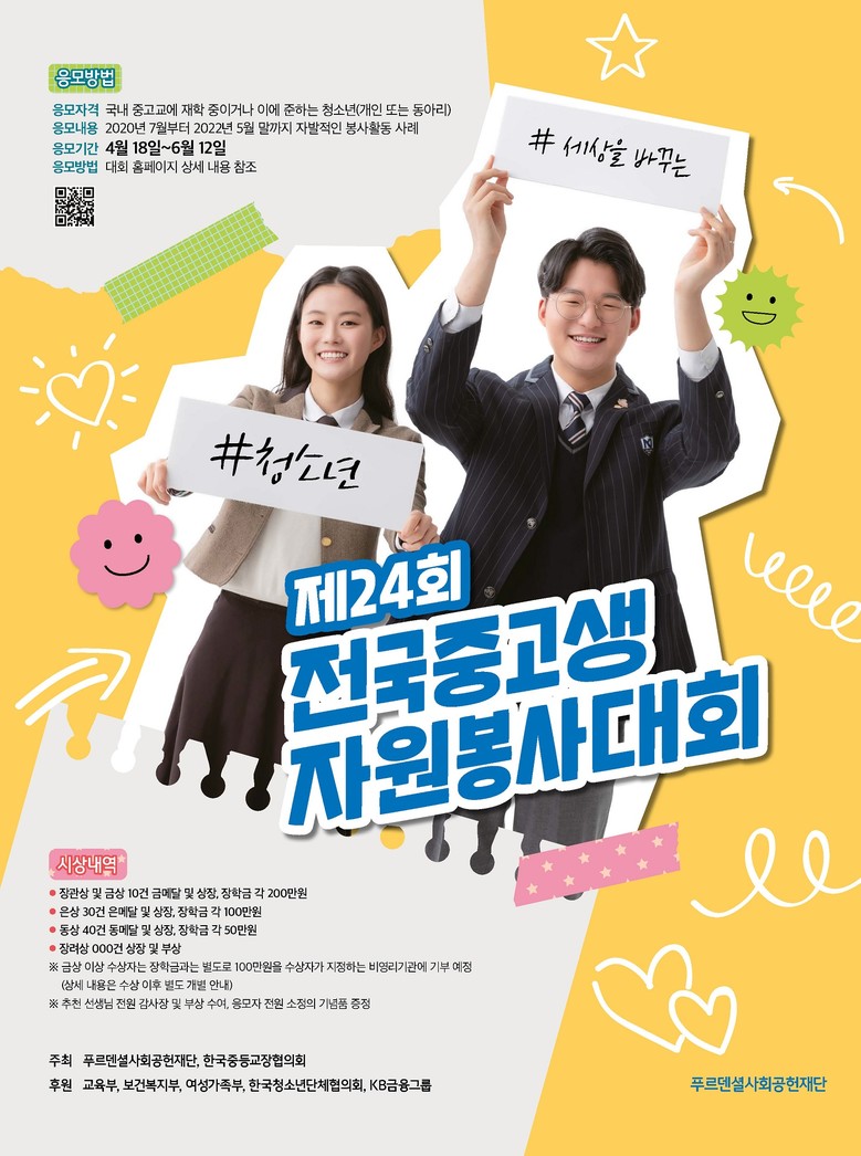 푸르덴셜사회공헌재단 관계자는 “올해로 24회를 맞이한 ‘전국중고생자원봉사대회’는 비대면이 일상화된 어려운 상황 속에서도 소외된 이웃과 지역사회를 위해 자원봉사를 실천해 온 청소년 자원봉사자들을 응원하고 격려하는 자리가 될 것”이라며, “앞으로도 더 많은 청소년의 주도적인 참여와 이에 대한 격려로 세상을 더욱 밝게 만들어 가기 위해 노력을 다할 계획”이라고 말했다.