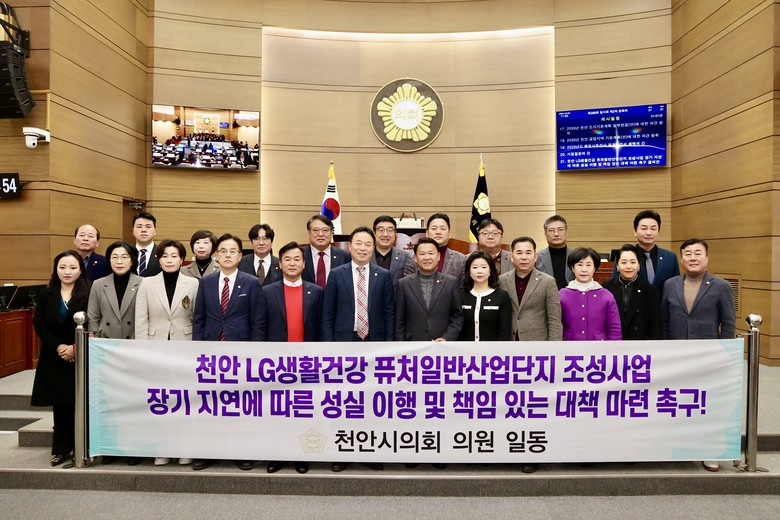 이번 결의안은 2014년 천안시와 ㈜LG생활건강이 MOU를 체결한 이후 10년이 지나도록 착공조차 하지 않고, 사업을 방치해 온 LG그룹의 무책임한 행태를 강력히 규탄하고, 이에 대한 책임 있는 대책 마련을 촉구하기 위해 마련됐다.