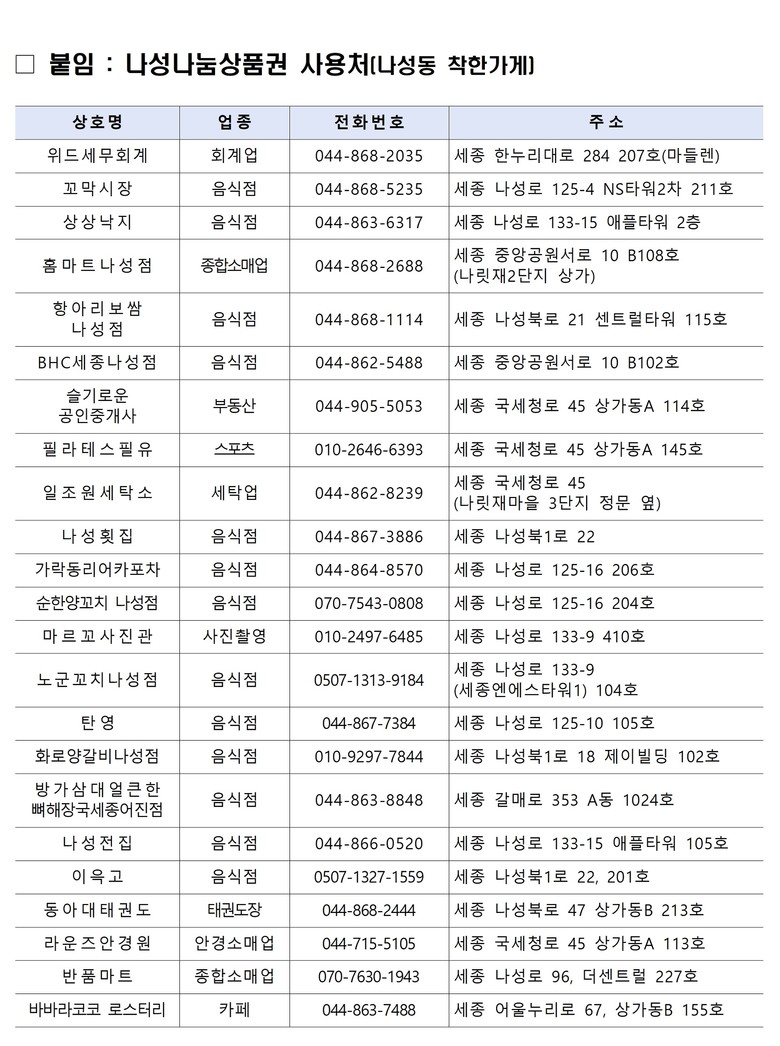 나성나눔상품권은 매월 정기적으로 기부에 참여하는 나성동 착한가게 23곳에서 사용할 수 있다.
