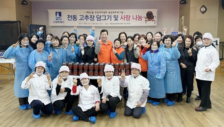 [수원시 세계타임즈=송민수 기자] 수원시 영통구 매탄2동 주민자치회(회장 주병기)에서는 지난 11일, 경기도전통음식협회와 함께 주민자치센터 특성화 프로그램으로 ‘전통 장 담그기 및 사랑 나눔’행사를 진행했다.