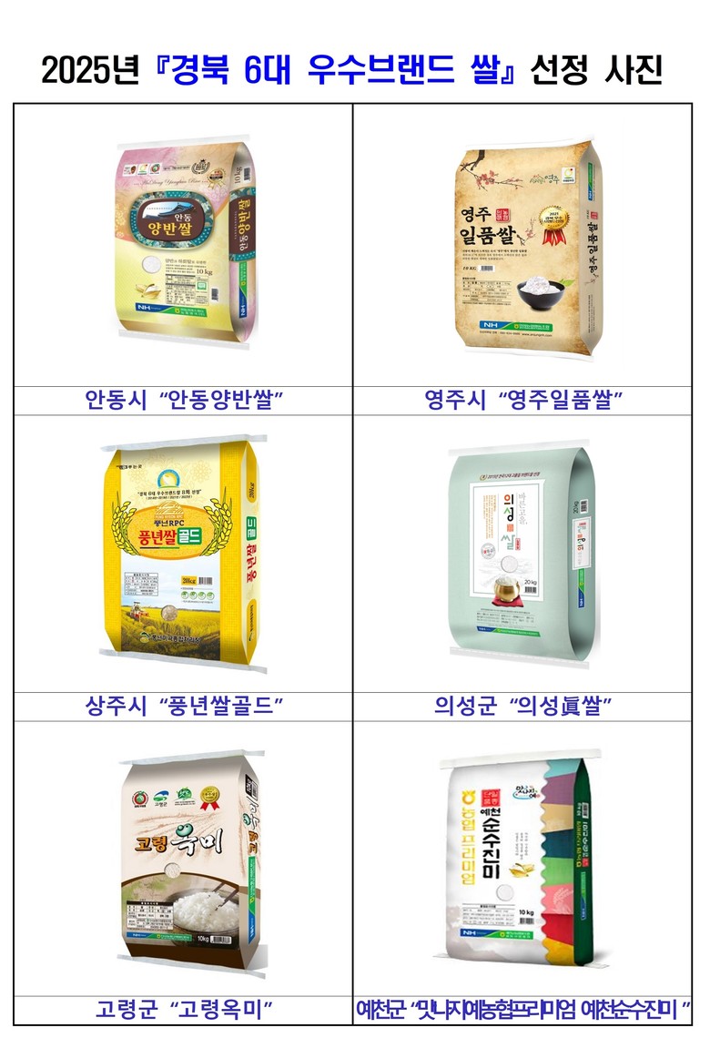 올해 선정된 6대 브랜드는 ▴농협양곡(주) 안동라이스센터의 ‘안동양반쌀’, ▴영주연합농협미곡종합처리장의 ‘영주일품쌀’, ▴농업회사법인 풍년(주)의 ‘풍년쌀골드’, ▴의성군농협쌀조합공동사업법인의 ‘의성眞쌀’, ▴고령다사농협RPC의 ‘고령옥미’, ▴예천군농협쌀조합공동사업법인의 ‘맛나지예농협프리미엄예천순수진미’이다.