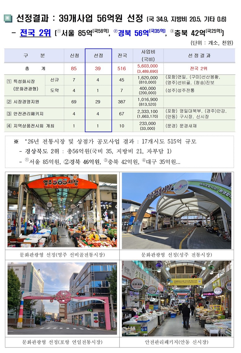 - 2026년 경상북도 전통시장 사업 300억원 투입, 특성화시장 구축과 안전관리에 중점 -