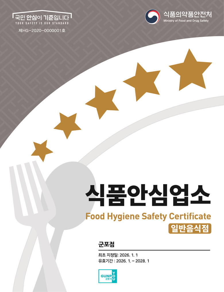 식품안심업소(음식점위생등급 지정업소)는 음식점 위생수준 향상과 소비자의 선택권을 보장하기 위해 위생상태를 평가하여 지정받은 음식점(일반.휴게음식점, 제과점)으로 군포시에는 현재 129개소가 지정.운영 중이다.