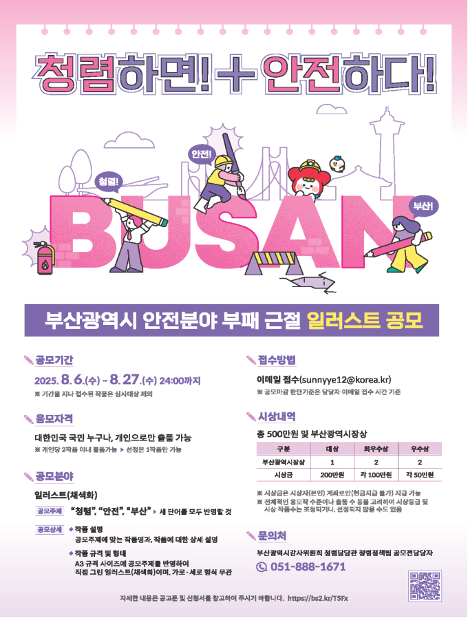 공모 분야는 ‘일러스트(채색화)’이며, 작품에는 ▲청렴 ▲안전 ▲부산 세 가지 단어 모두를 반드시 포함해야 한다.